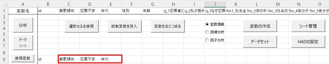 まずデータを確認します。今回のデータでは、厳罰傾向を測定する項目は3個あり、cj_1からcj_3までの列に入力されています。因子分析ではこれらのデータを使いますので、これらをコピーして、「id」の横に貼り付けてください。