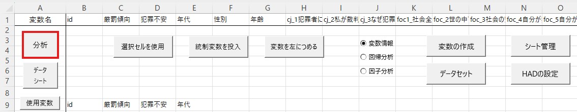 ここまでで厳罰傾向を測定する5つの項目を1つの変数として扱っていいことが分かりましたので、次はこれらの5項目の平均値を算出し、それを厳罰傾向の値とします。合成変数の作成にはエクセルのaverage関数を使うやり方もありますが(関数を使ったことがある方にとってはおそらくそちらの方が通常楽です)、ここではHADの機能を使ったやり方を解説します。