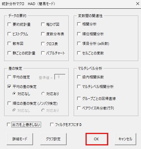 表示されたポップアップ画面で、左下の方にある「平均の差の検定」にチェックを入れてください。その下にある「対応なし」と「対応あり」については変えなくて大丈夫です。