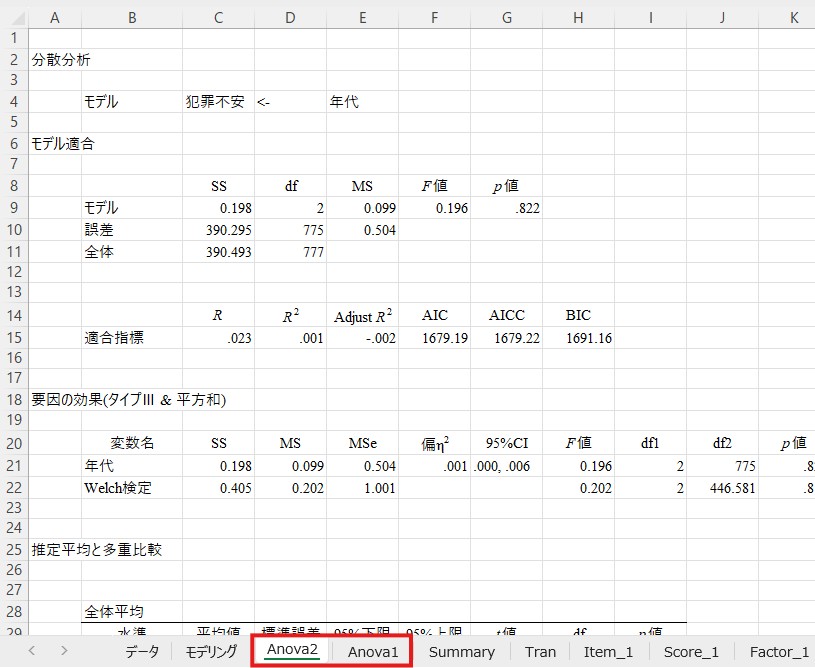 従属変数の数だけ「Anova」というシートが作成されます。ここでは厳罰傾向と犯罪不安という2つの従属変数がありますので、「Anova1」(厳罰傾向の結果)、「Anova2」(犯罪不安の結果)の2つのシートが新たに作成されれば成功です。