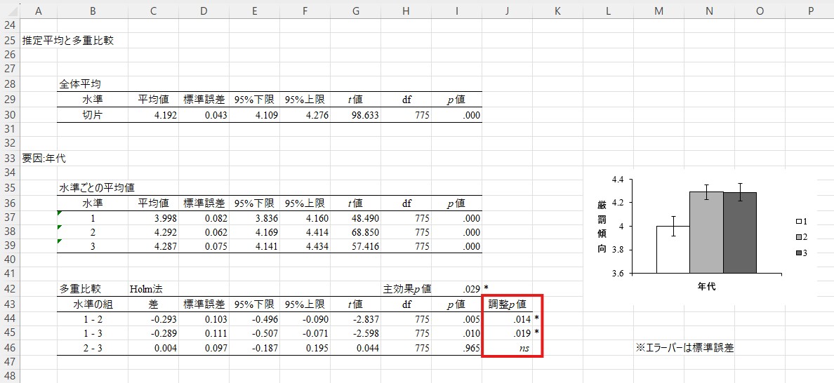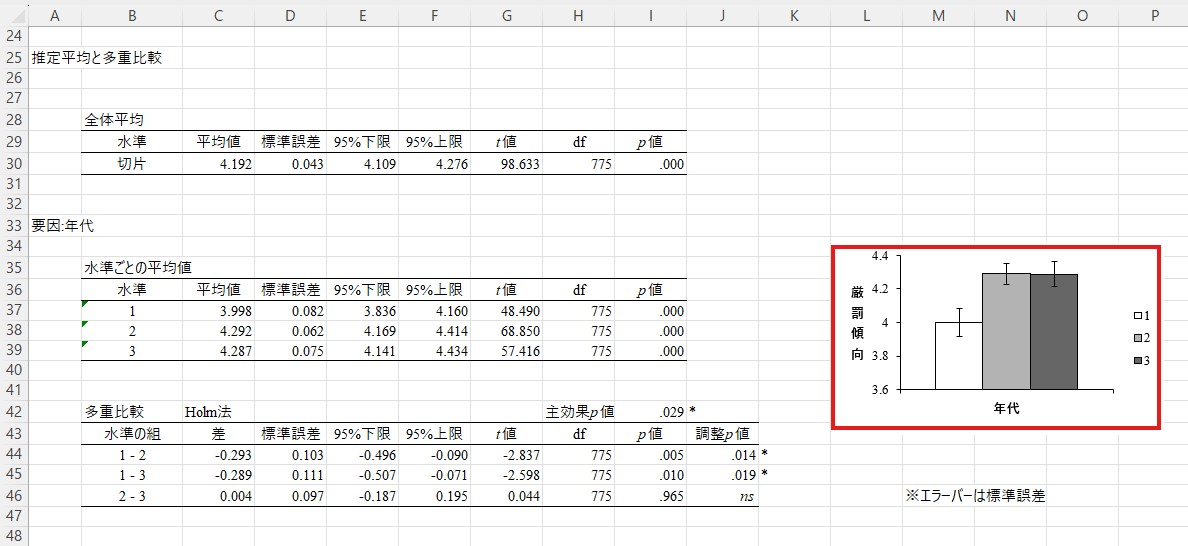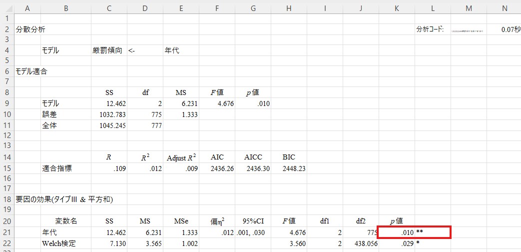 上の読み方に沿って、まず厳罰傾向に関する結果(「Anova1」のシート)を見てみましょう。①に対応する結果は、上の方にある「要因の効果」のp値で確認することができます。ここで「年代」のp値は.010になっています。多くの分析と同じく、p値が0.05以下であった場合には有意、0.05を超える場合には有意でないと判断します。したがって、厳罰傾向に対する年代の効果は有意ということになります。別の言い方をすれば、年代のグループのどこか同士に差があることが分かったということです。