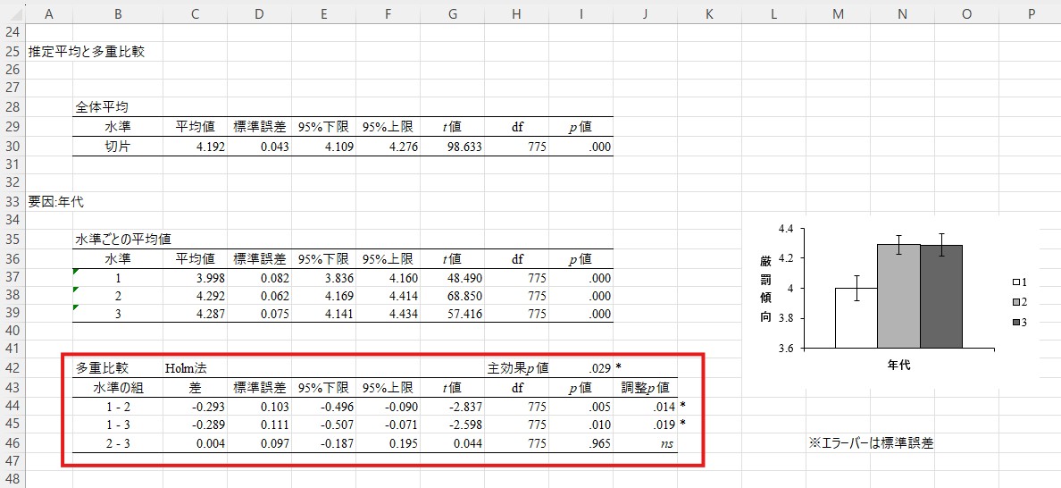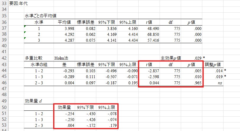 緑でハイライトした部分では、多重比較の結果が記述されています。「若年層」などの各水準の初出の箇所で記述統計(平均値と標準誤差)を記述して、記述統計とまとめています。また、組み合わせごとの比較の後には統計量(t値、p値など)をまとめています(可能ならこれらの値も表にまとめたいところですが、入れ込むのは中々難しいと思います)。これらの値は下記画像の赤で囲った部分に記述されています。