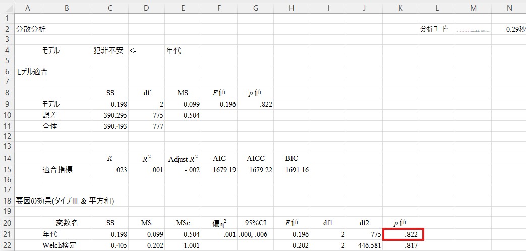 次に、犯罪不安に関する結果(「Anova2」のシート)も見てみましょう。「要因の効果」の中にある「年代」のp値を見てみると.822になっています。これは.05を上回っていますので、年代の効果は有意でないということになります。別の言い方をすれば、回答者の年代によって犯罪不安に差があるとはいえないことが分かりました。