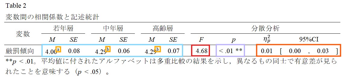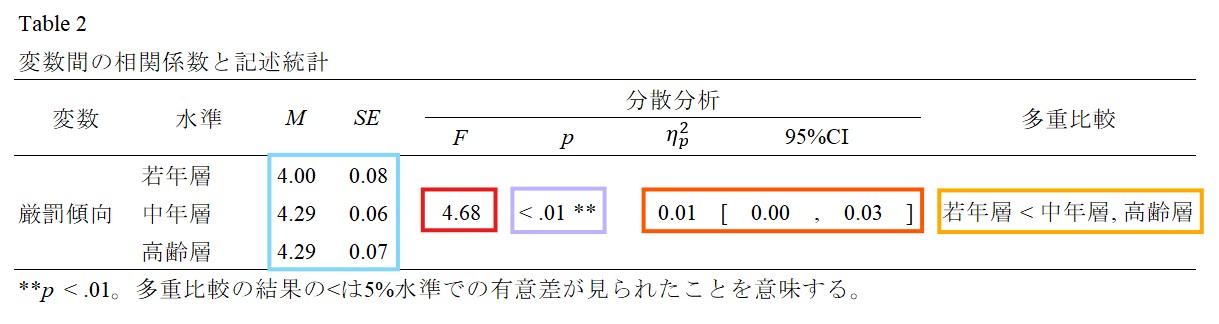 緑でハイライトした部分では、分散分析の結果が記述されており、どこかの水準間に差があるかが検討されています。書かれている数値は表に記述されているものと同じです。厳罰傾向の場合は有意となったので多重比較に進み、犯罪不安の場合は有意とならなかったので多重比較には進まず打ち切っています。