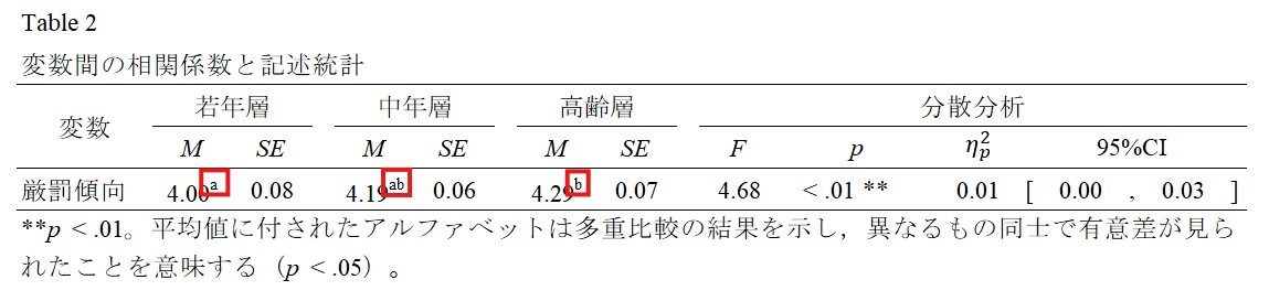 なお、今回の場合は表記がしやすいパターンですが、若年層と中年層および中年層と高齢層には有意差がないが若年層と高齢層には有意差がある、というような面倒な表記しにくいパターンもあります。そうした場合にはアルファベットを二つ重ね、若年層にa、中年層にab、高齢層にbを付すことで表記します。こうすれば、若年層と中年層はa、中年層と高齢層はbという同じアルファベットを共有しているため有意差がないことが示せる一方、若年層と高齢層はaとbという異なるアルファベットが付されているため有意差があることが示せるからです。下画像のような形です。