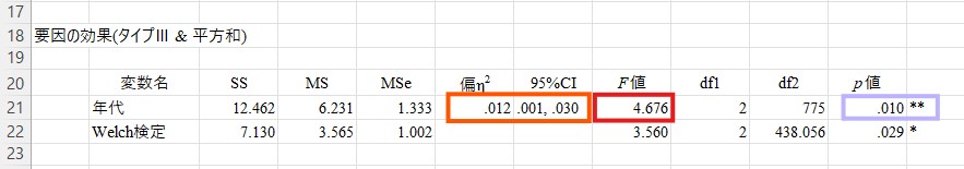 その結果,Table 2に示される通り,年代の効果は有意であった(F(2, 775) = 4.68, p < .01, 偏η2 = 0.01, 95%CI [0.00, 0.03])