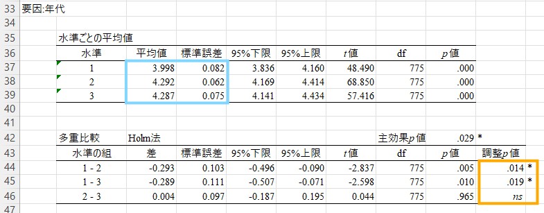 そこで、②の段階に進み、具体的にどこに差があるのかを検討します。それに対応する結果は、少し下の「推定平均と多重比較」の欄に書かれています。この中の「多重比較」という表には、水準(ここでは年代です)ごとの差の検定が行われています。ここでは「1」=「若年層」、「2」=「中年層」、「3」=「高齢層」でコーディングされていますので、「1-2」の行は「若年層と中年層の比較」、「1-3」の行は「若年層と高齢層の比較」、「2-3」は「中年層と高齢層の比較」になります。
