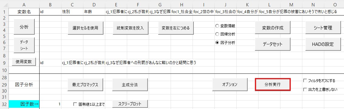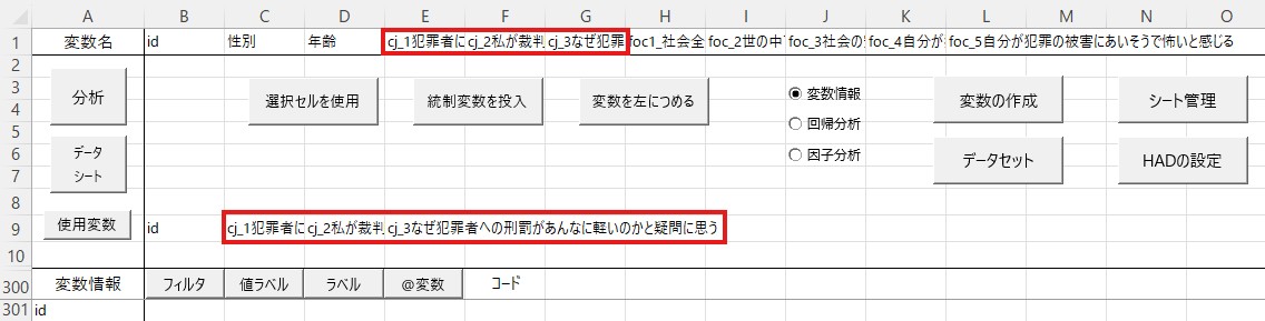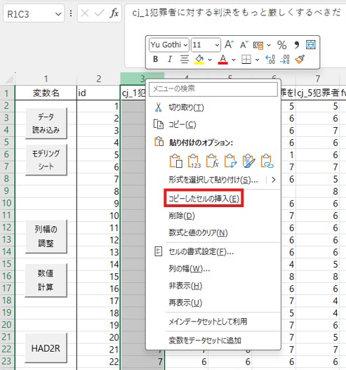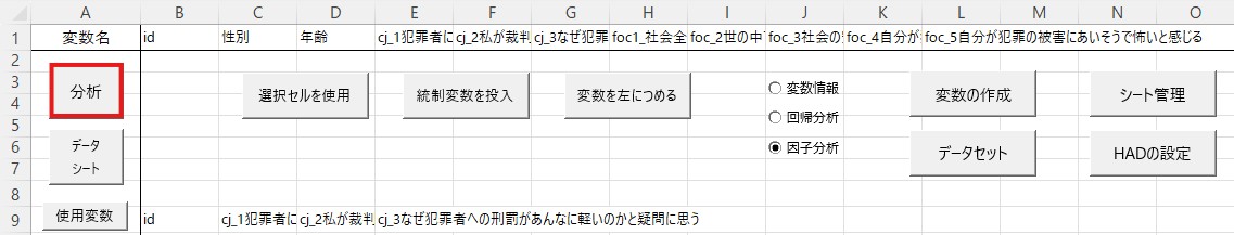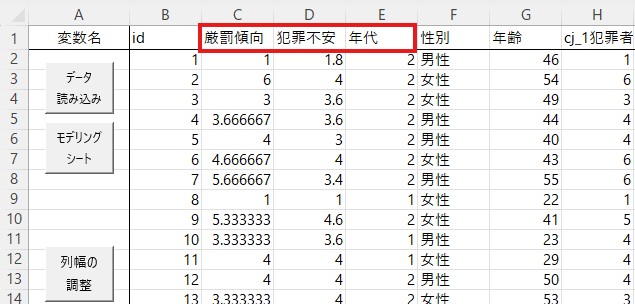 まずデータを確認します。今回のデータでは、厳罰傾向を測定する項目は3個あり、cj_1からcj_3までの列に入力されています。因子分析ではこれらのデータを使いますので、これらをコピーして、「id」の横に貼り付けてください。