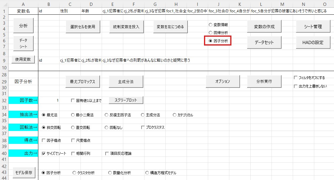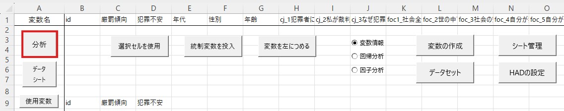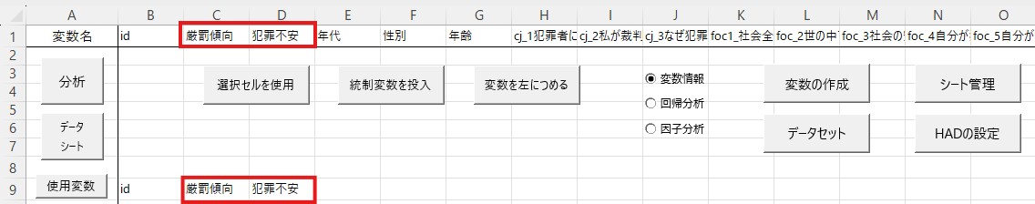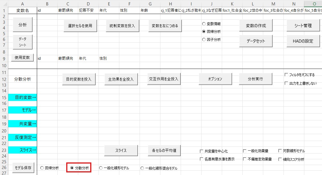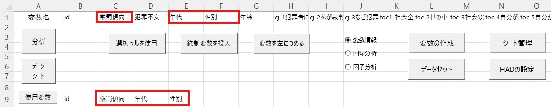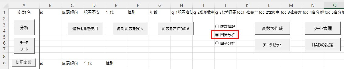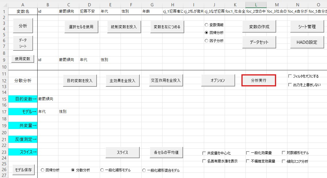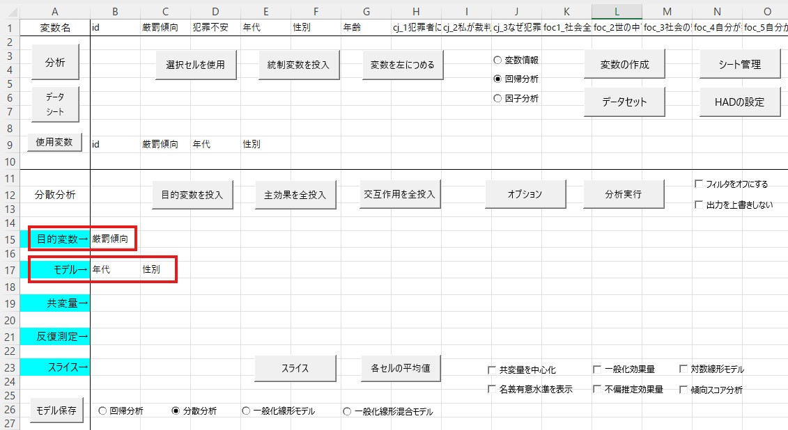 「目的変数」の横に「厳罰傾向」を、「モデル」の横に「年代」と「性別」をコピペします(HADでは「目的変数」は従属変数、「モデル」は独立変数を意味します)。