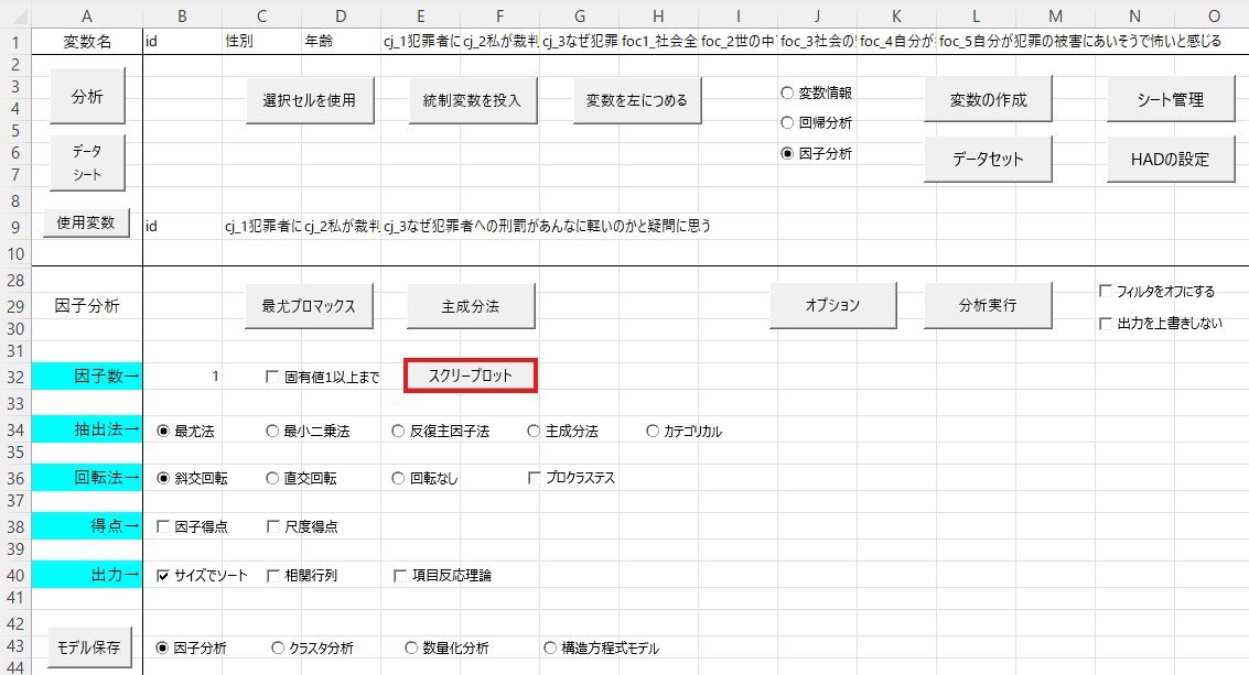 因子分析の前に、因子数を決める必要があります。「スクリープロット」を左クリックしてください。