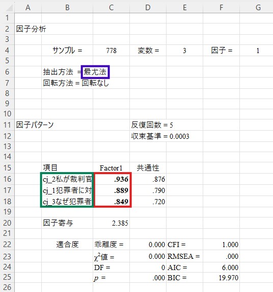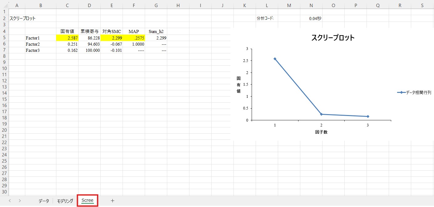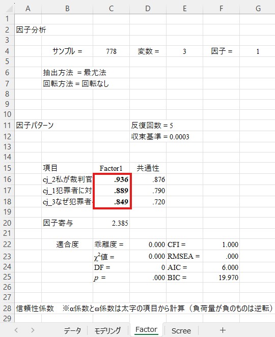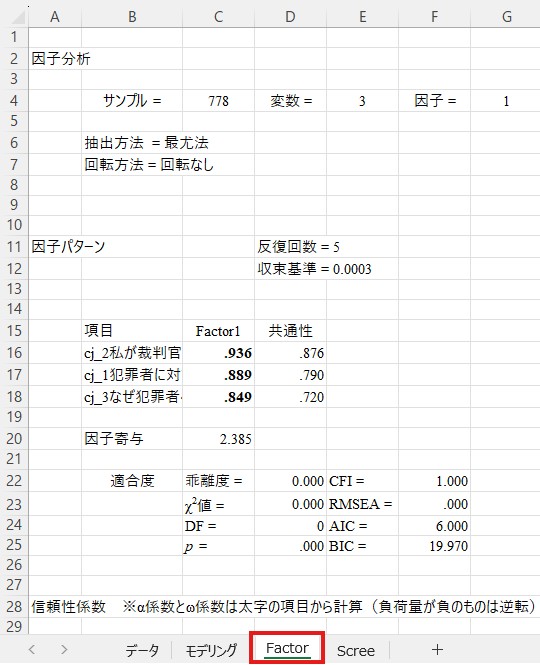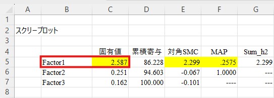 このシートには、固有値や累積寄与、対角SMCの値などが表示されています。これらの数値から因子数を決定する手法には色々なものがありますが、初学者の方にとっては固有値で色が付いている因子数を選択するのが最も楽かと思います。ここでは「Factor1」に色が付いていますので、1因子構造が妥当であると判断できます。