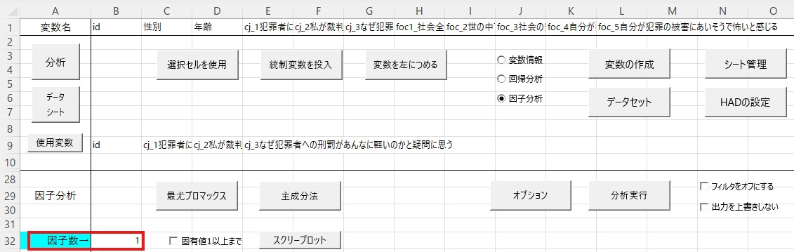 もう一度「モデリング」のシートに戻り、「因子数」に「1」を入力してください(必ず半角で入力してください)。