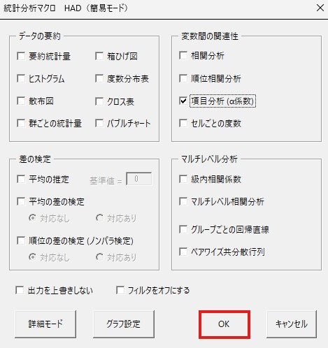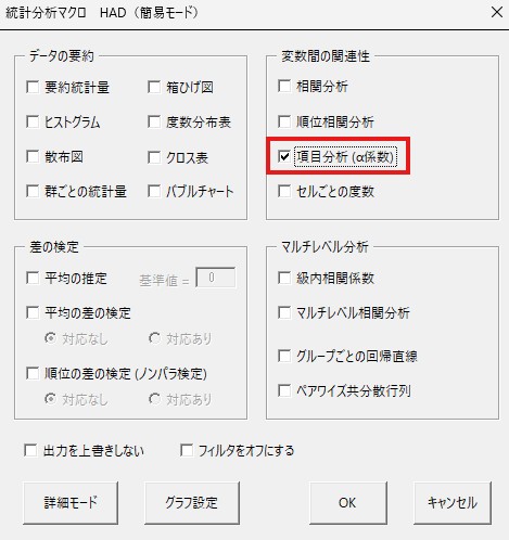 表示されたポップアップ画面で、右上の方にある「項目分析(α係数)」にチェックを入れます。
