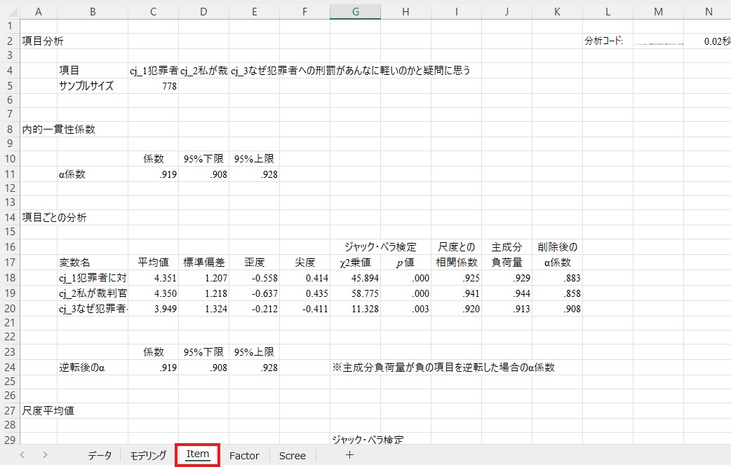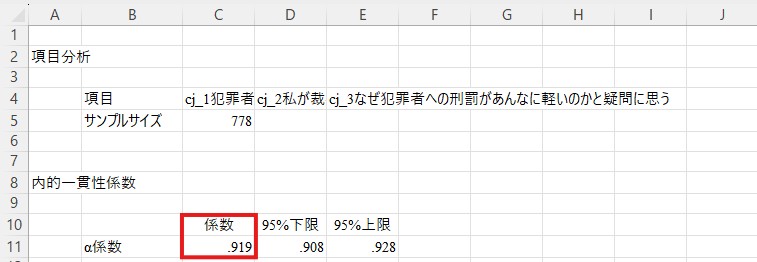 信頼性係数は上の方の「α係数」の横に表示されています。ここでは.864が厳罰傾向のα係数です。一般にα係数は.70以上であれば問題ないとされますので、ここでは特に問題はなさそうですので先に進みます。