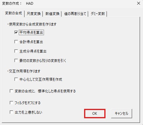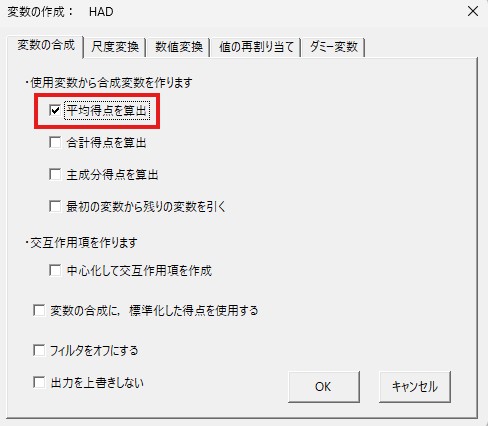ここまでで厳罰傾向を測定する5つの項目を1つの変数として扱っていいことが分かりましたので、次はこれらの5項目の平均値を算出し、それを厳罰傾向の値とします。合成変数の作成にはエクセルのaverage関数を使うやり方もありますが(関数を使ったことがある方にとってはおそらくそちらの方が通常楽です)、ここではHADの機能を使ったやり方を解説します。