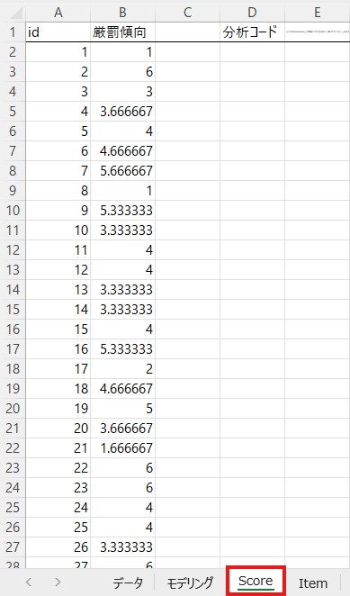 「Mean」の列には「使用変数」に入力した項目の平均値が入っています。ここでは5つの項目を入力しましたので、その5つの項目の平均値が計算されています。