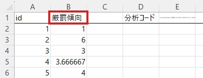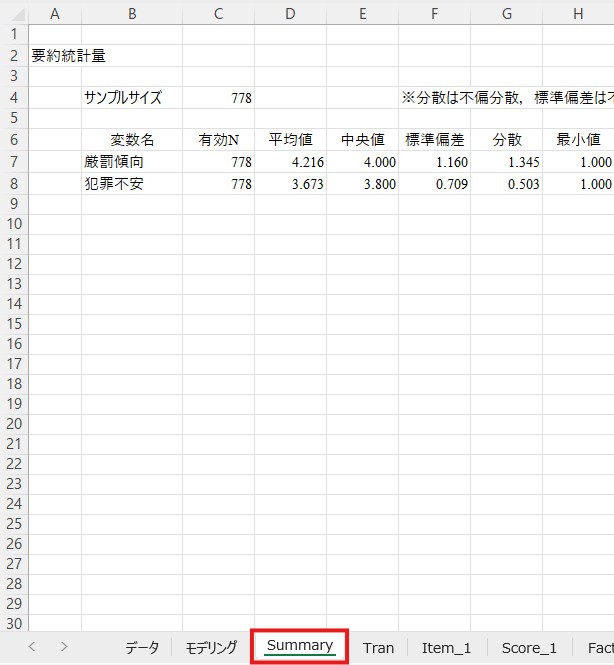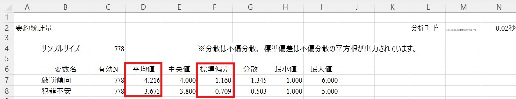 「平均値」と「標準偏差」の列にそれぞれの値が表示されています。たとえばここでは厳罰傾向の平均値は4.244、標準偏差は1.100であることが分かります。
