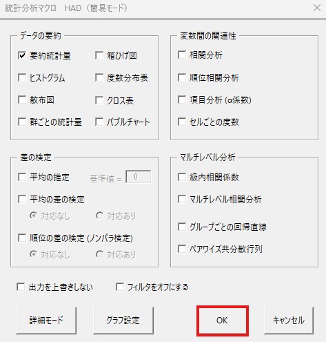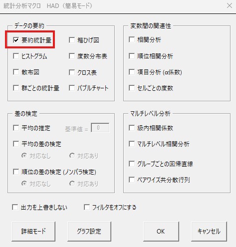 表示されたポップアップ画面で、左上の方にある「要約統計量」にチェックを入れてください。