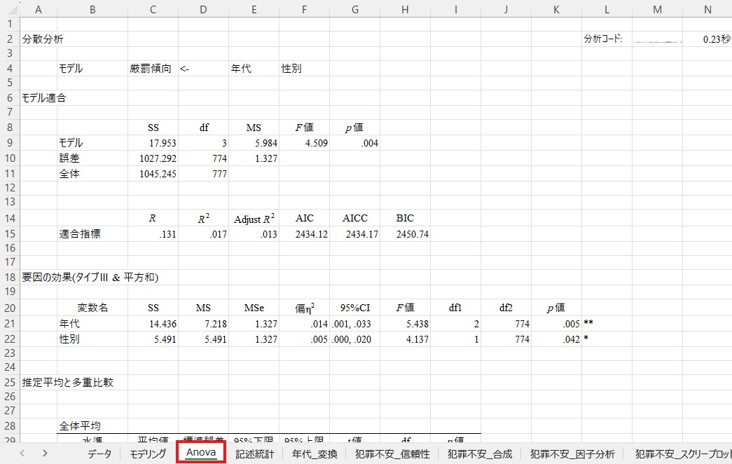 以上をまとめると、中年層および高齢層は若年層と比べて有意に厳罰的である(あるいは、中年層および高齢層と比べて若年層は有意に厳罰的でない)とまとめることができます。