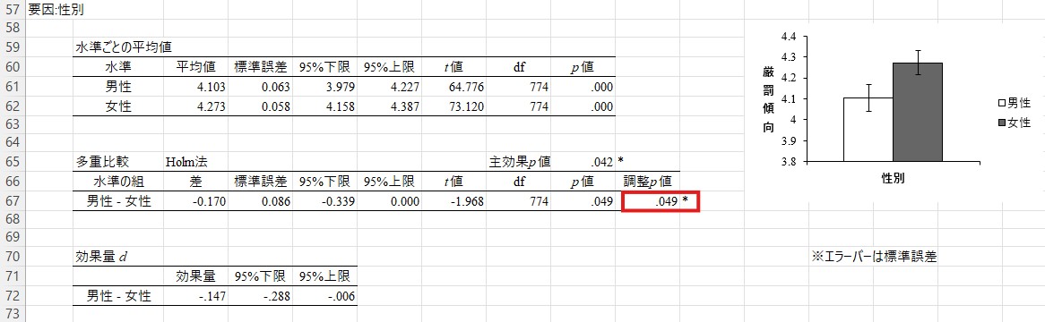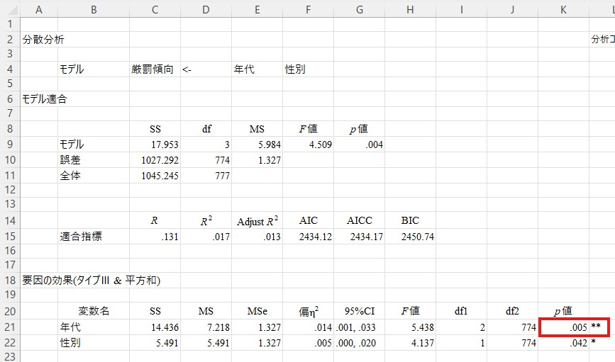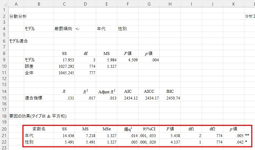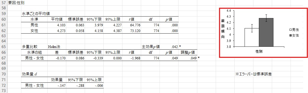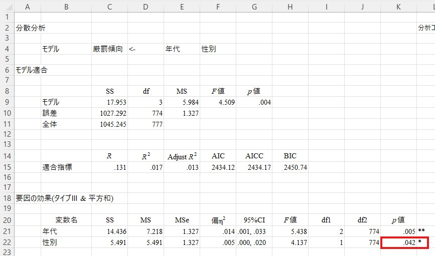 また、性別のp値は.042となっており、こちらも.05以下です。したがって、性別ごとに厳罰傾向の差があると言えます。