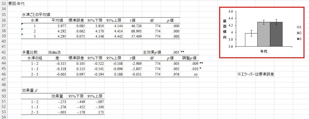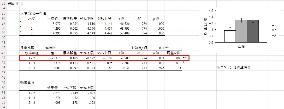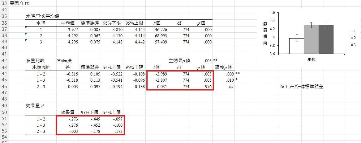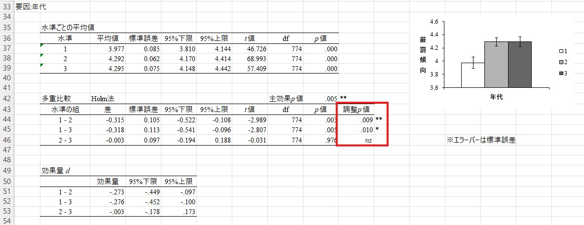 それぞれの結果を見てみると、「1-2」の差に関する調整p値は.09ですので、.05以下です。したがって有意です。「1-3」の差も.010ですので有意です。他方、「2-3」の差は「ns」(Non-Significant(非有意)」の略です)となっておりますので有意ではありません。まとめると、若年層と中年層の差と若年層と高齢層の差は有意だが、中年層と高齢層の差は有意でないということになります。