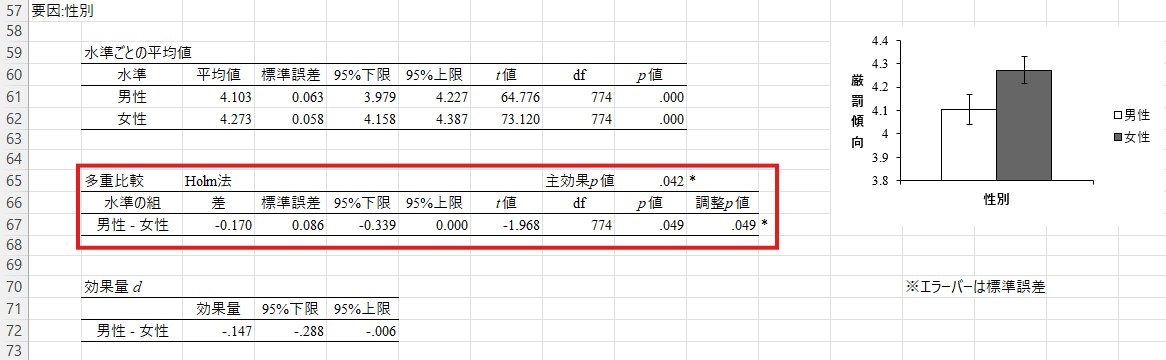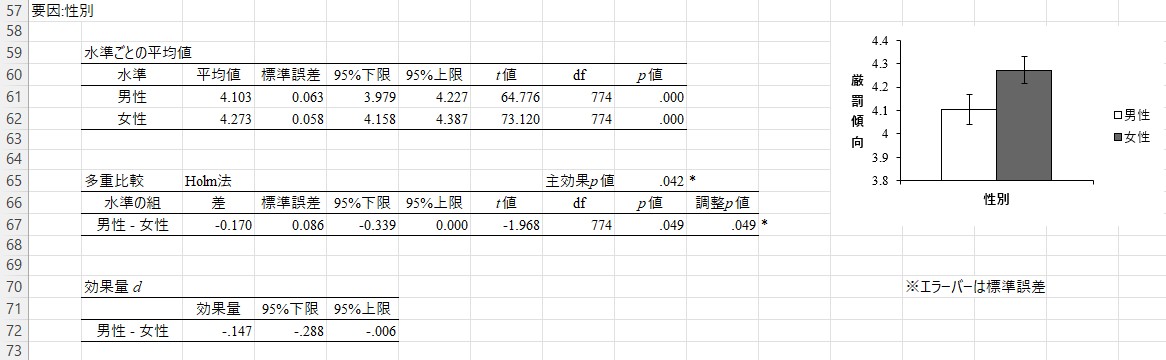 同じようにして、性別の結果も見てみましょう。「要因:性別」の結果がまとめられています。