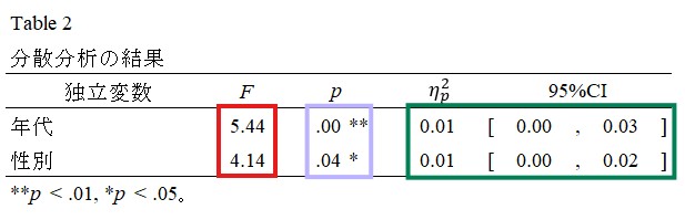 赤でハイライトした部分では、分析全体の枠組みが記述されています。ここでは要因(独立変数)は「年代」と「性別」の2つですので「2要因」になります。そして、「年代」には「若年層・中年層・高齢層」の3つのグループがあり、「性別」には「女性・男性」の2つグループがありますので、これらをまとめて「3 × 2」と表記しています。数字の後に水準の内訳(「若年層」など)を書く必要は必ずしもないかもしれませんが、確実に分かりやすくなると思いますので、書くことをお勧めします。各水準に含まれるデータは異なる回答者から得られたデータですので「参加者間」となります。