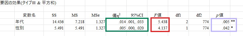 これに対応する結果は、「要因の効果」の欄の中に書かれています。独立変数ごとに結果がまとめられています。上の行は年代の効果、下の行は性別の効果です。