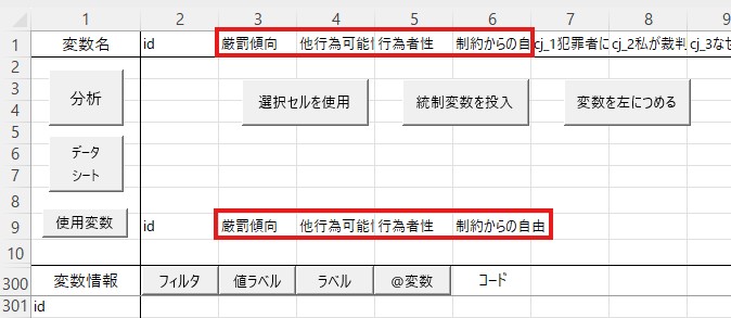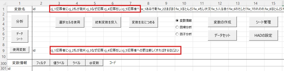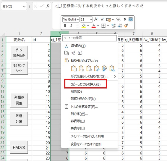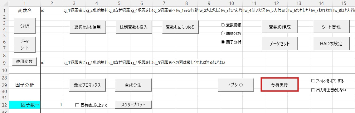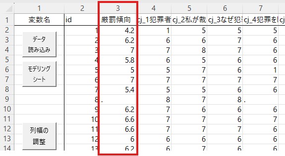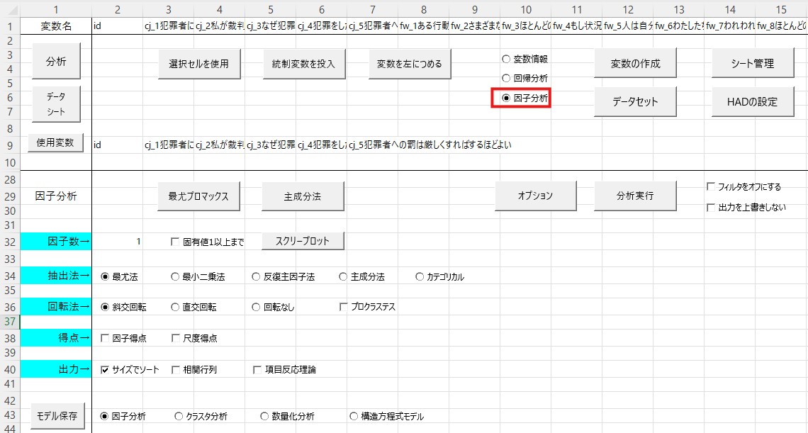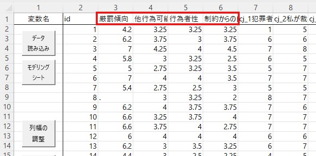 まずデータを確認します。今回のデータでは、厳罰傾向を測定する項目は22個あり、cj_1からcj_5までの列に入力されています。因子分析ではこれらのデータを使いますので、これらをコピーして、「id」の横に貼り付けてください。