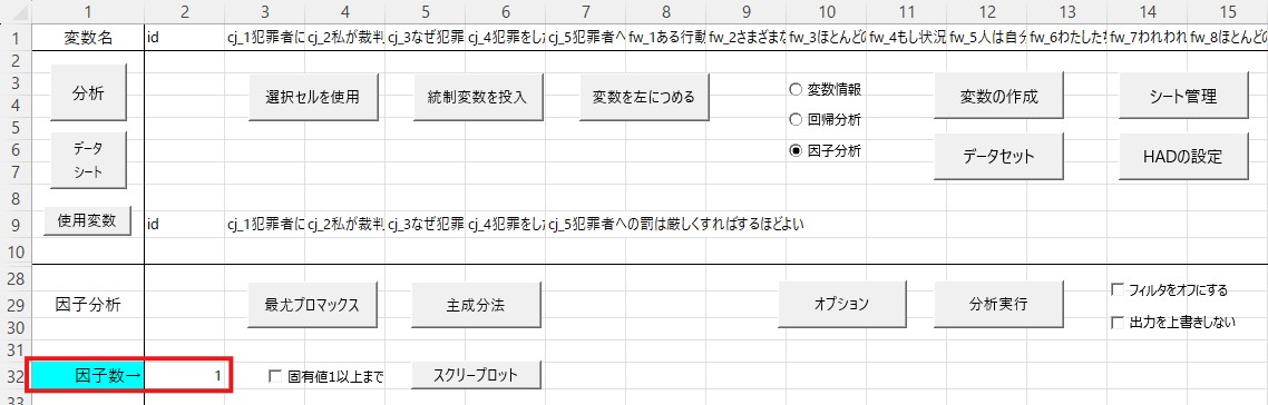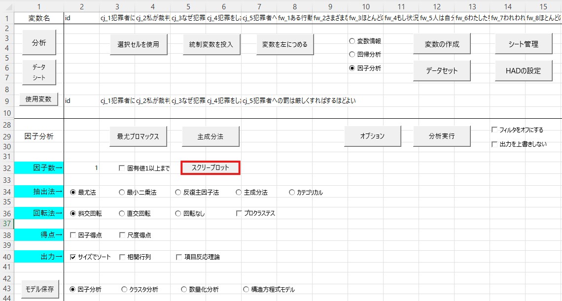 ここで使われている変数(刑事司法に対する態度と自由意志信念)は実際には先行研究で因子構造が確認されています(つまり、何個の因子に分かれるかはすでに示されています)。ですので、本来であれば因子分析をする必要はありませんが、あくまで例として因子分析も行っています。自分のデータを使って分析する方はご注意ください。