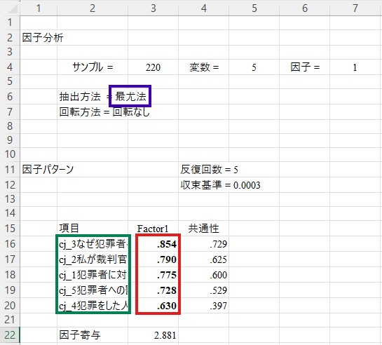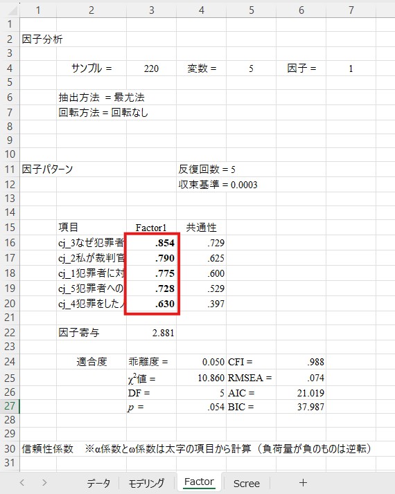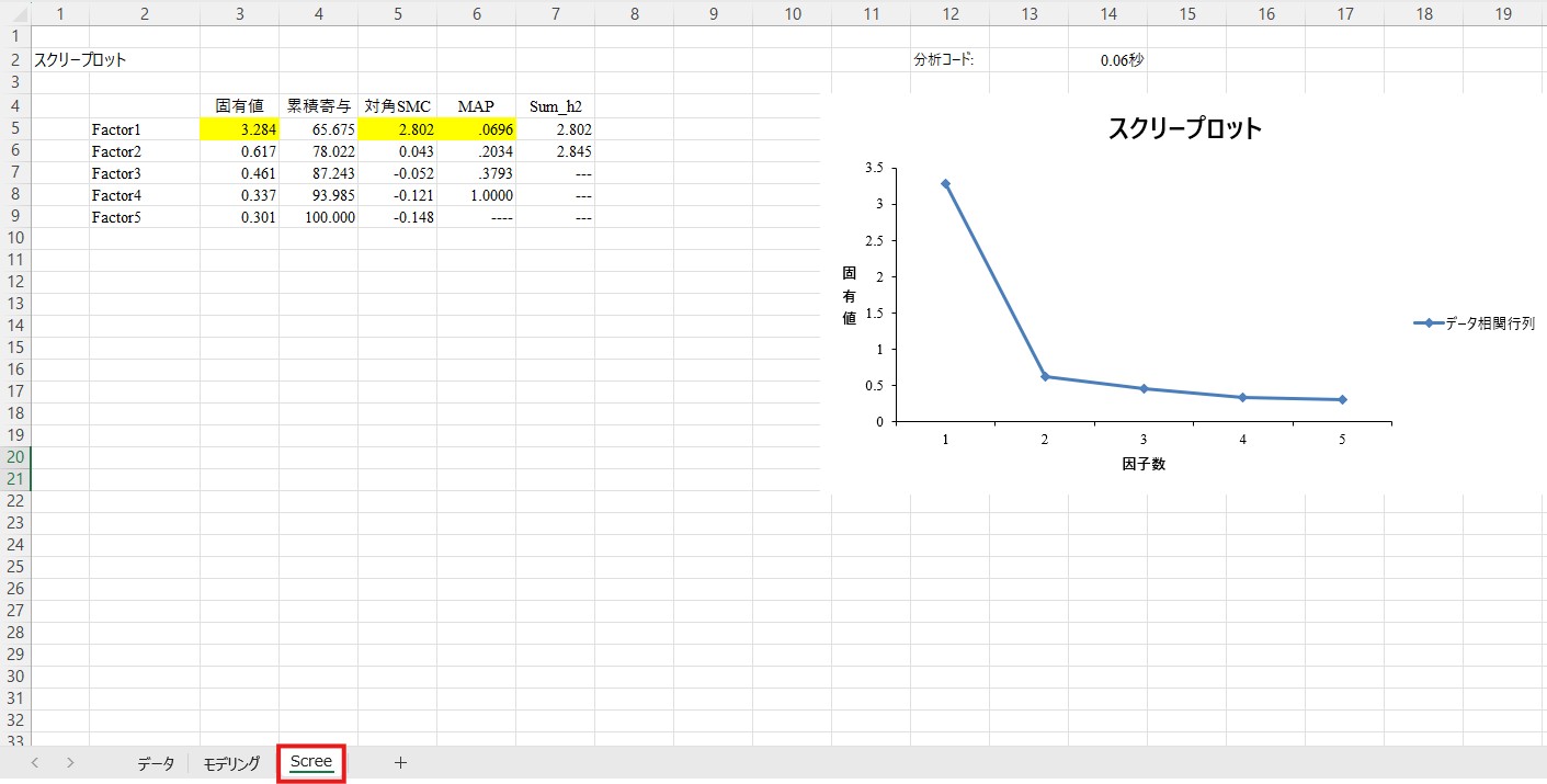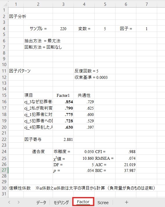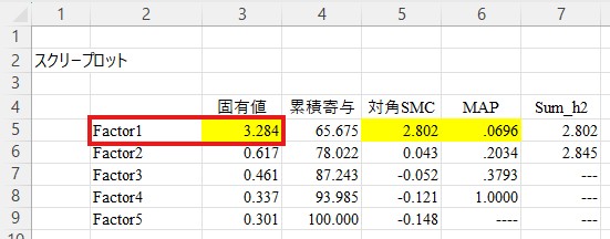 このシートには、固有値や累積寄与、対角SMCの値などが表示されています。これらの数値から因子数を決定する手法には色々なものがありますが、初学者の方にとっては固有値で色が付いている因子数を選択するのが最も楽かと思います。ここでは「Factor1」に色が付いていますので、1因子構造が妥当であると判断できます。