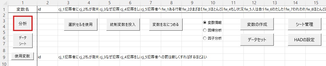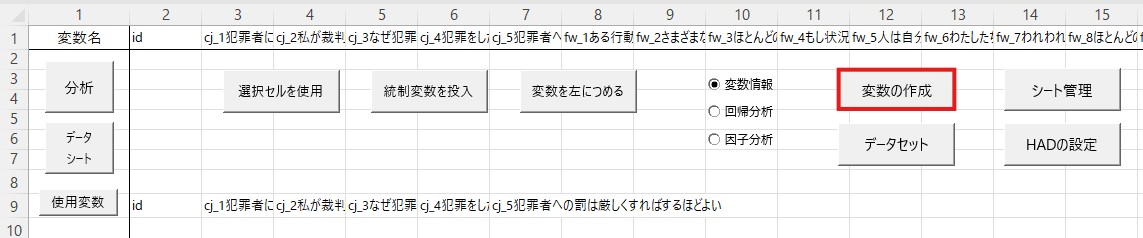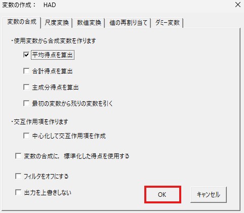 ここまでで厳罰傾向を測定する5つの項目を1つの変数として扱っていいことが分かりましたので、次はこれらの5項目の平均値を算出し、それを厳罰傾向の値とします。合成変数の作成にはエクセルのaverage関数を使うやり方もありますが(関数を使ったことがある方にとってはおそらくそちらの方が通常楽です)、ここではHADの機能を使ったやり方を解説します。