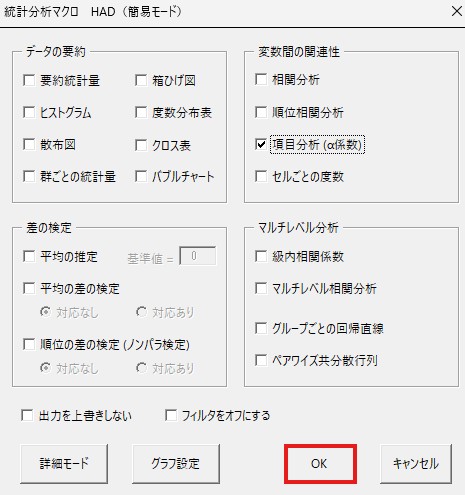 表示されたポップアップ画面で、右上の方にある「項目分析(α係数)」にチェックを入れます。