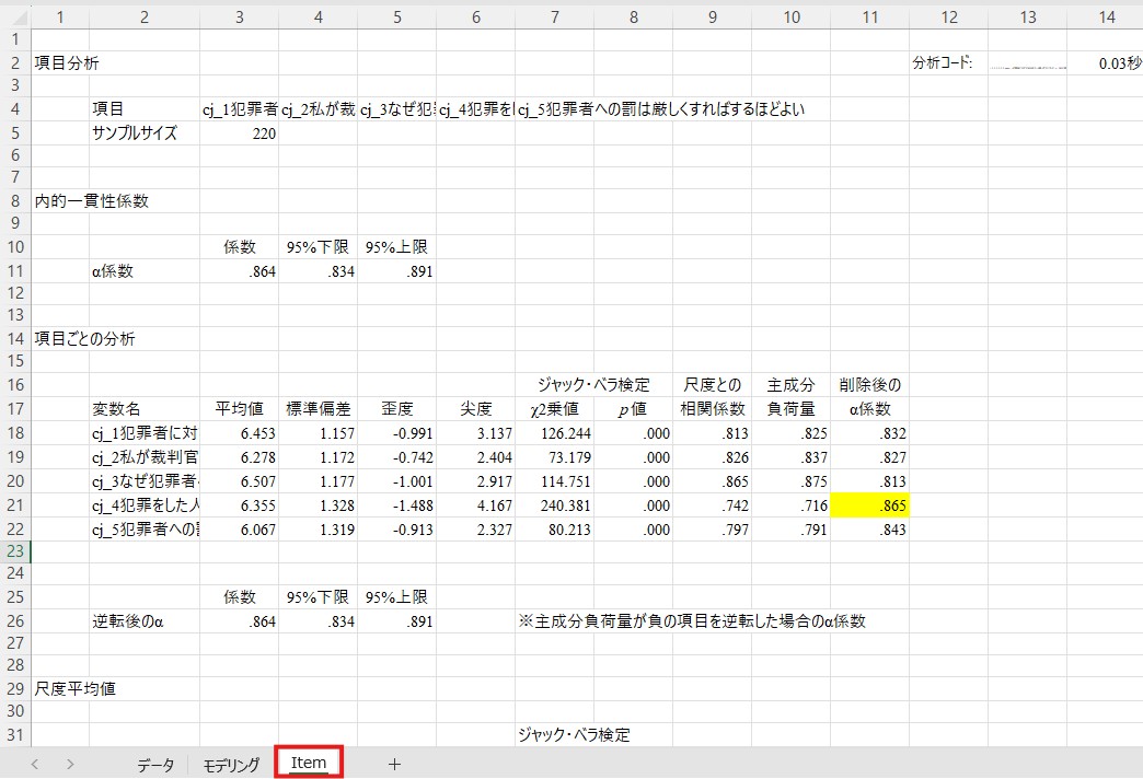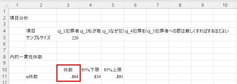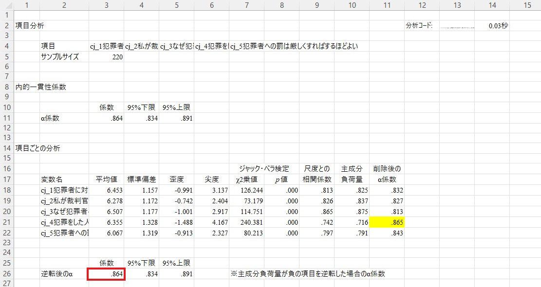 信頼性係数は上の方の「α係数」の横に表示されています。ここでは.864が厳罰傾向のα係数です。一般にα係数は.70以上であれば問題ないとされますので、ここでは特に問題はなさそうですので先に進みます。