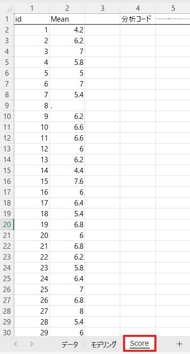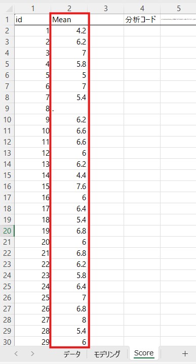「Mean」の列には「使用変数」に入力した項目の平均値が入っています。ここでは5つの項目を入力しましたので、その5つの項目の平均値が計算されています。