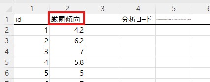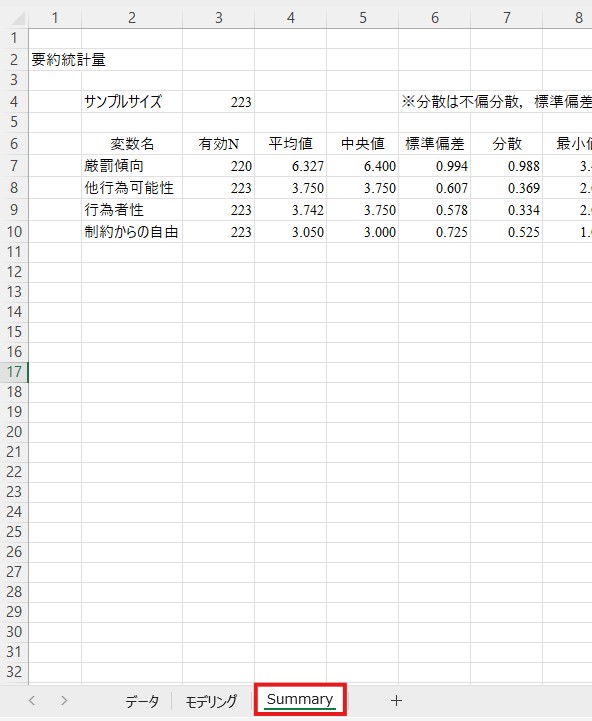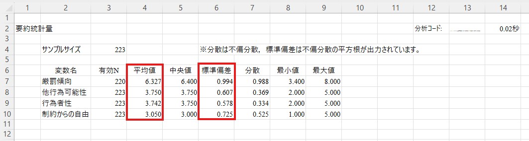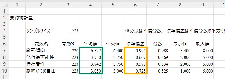「平均値」と「標準偏差」の列にそれぞれの値が表示されています。たとえばここでは厳罰傾向の平均値は6.327、標準偏差は0.994であることが分かります。