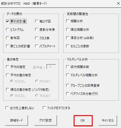 表示されたポップアップ画面で、左上の方にある「要約統計量」にチェックを入れてください。