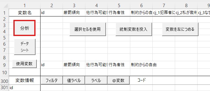 「データ」のシートで「データ読み込み」をクリックしたうえで、平均値と標準偏差を求めたい変数を「使用変数」の横に貼り付けます。