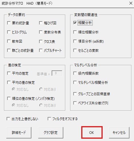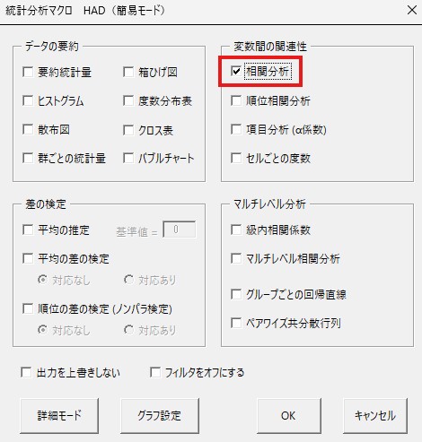 右上にある「相関分析」にチェックを入れてください。