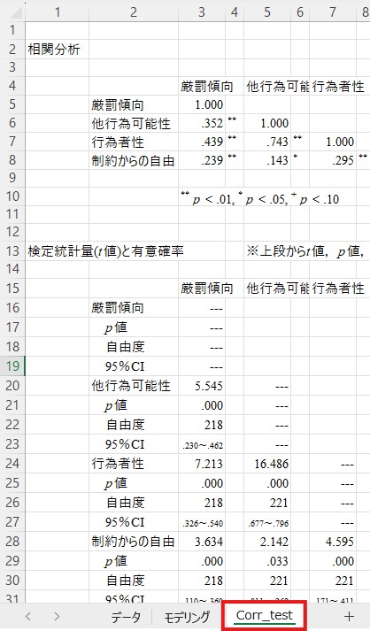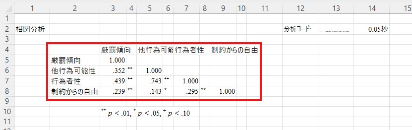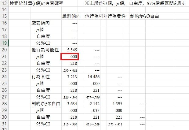 正確なp値を知りたい場合には少し下にあるもう1つの表を見ます。ここを見ると、たとえば厳罰傾向と他行為可能性の相関のp値は「.000」ですので「1%水準で有意」であることが分かります。