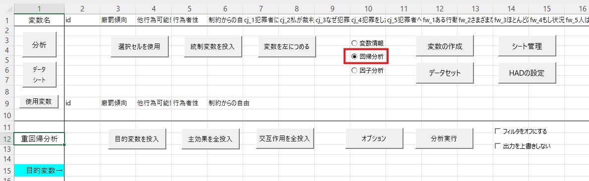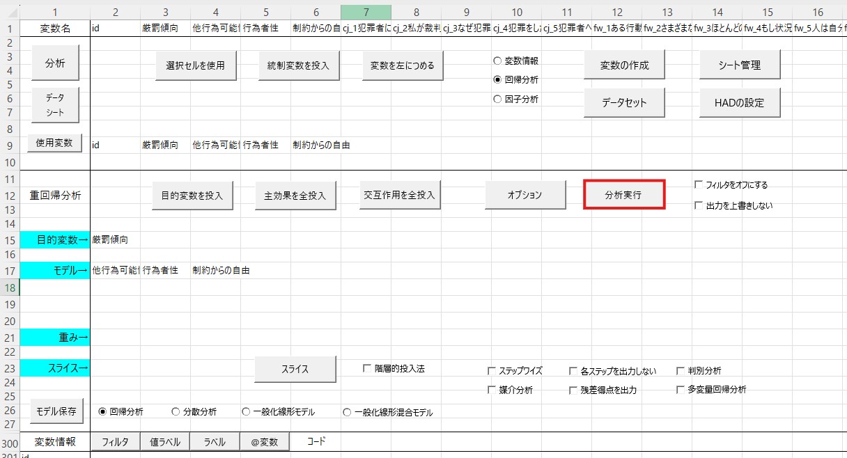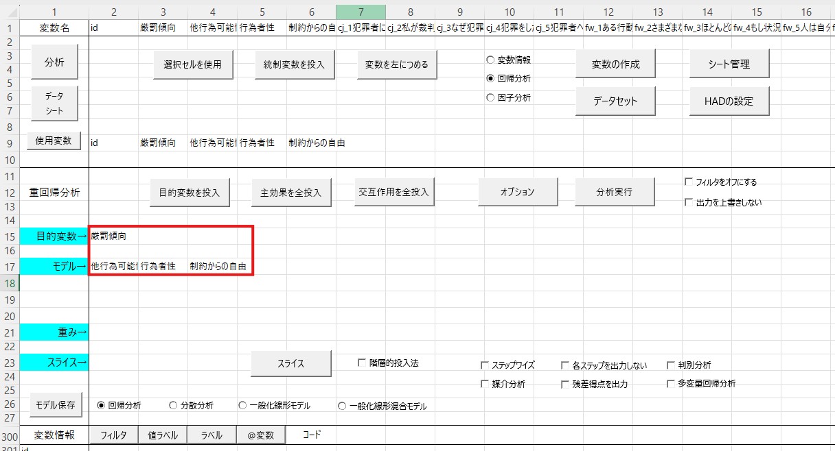 まず重回帰分析に投入する変数を「使用変数」の横にコピペします。ここでは厳罰傾向を従属変数、自由意志信念の3つの因子(他行為可能性、行為者性、制約からの自由)を独立変数としますので、これらの4つの変数をコピペします(相関分析から続けて分析している場合には変更する必要はありません)。