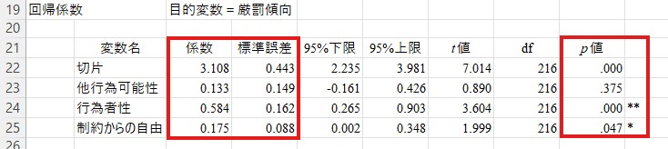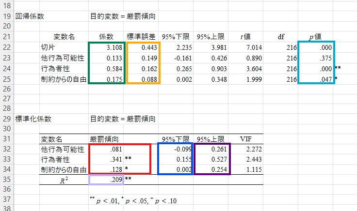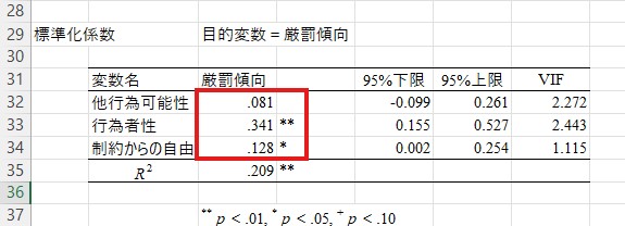 まず少し下にある「標準化係数」の表を見てください。この表の赤で囲った値は「標準化偏回帰係数」(論文ではよく「β」と表記されます)と有意性です。値の範囲は-1から1で、読み方は相関係数を同じです。有意性の読み方(「**」など)の読み方も相関係数と同じです。ここではたとえば、厳罰傾向と行為者性の値は.341となっており、「**」が付いています。したがって、厳罰傾向と行為者性は正比例の関係にある(つまり、自由意志を信じる人ほど犯罪者に対して厳しい刑罰を求める」傾向があり、この関係性は1%水準で有意であると読み取ることができます。