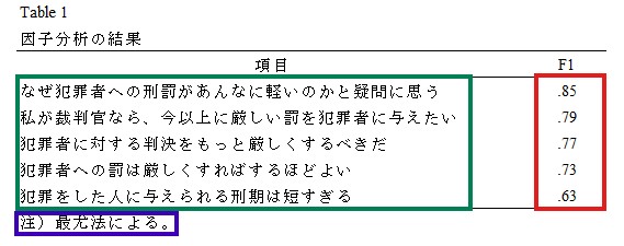 厳罰傾向を測定する5項目について探索的因子分析を行った。まず固有値の減衰状況を確認したところ,3.28, 0.62, 0.46, 0.34, 0.30と,明確に1因子構造が示唆される結果であったため,1因子解を指定して分析を行った。その結果,Table 1に示される通り,すべての項目の因子負荷量は.40以上であった。そのため,全項目の平均値を算出し,以後の分析に使用した。