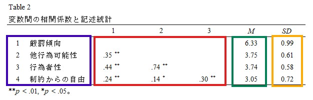 一番上の部分では相関係数が表示されています。たとえば、厳罰傾向と他行為可能性の相関係数は.352であることが分かります。横についている「**」(アスタリスクと読みます)は、有意水準を示しており、「**」であれば「1%水準で有意」、「*」であれば「5%水準で有意」、「†」(ダガーと読みます)であれば「10%水準で有意」であることをそれぞれ意味します。