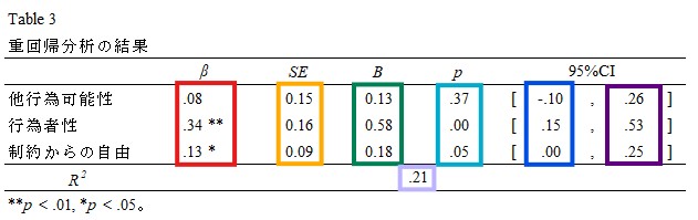 最後に,厳罰傾向を従属変数,自由意志信念の3因子(他行為可能性,行為者性,制約からの自由)を独立変数とした重回帰分析を行った。Table 3に示される通り,行為者性(β = .08, p < .01, 95%CI [.15, .53])および制約からの自由(β = .13, p = .05, 95%CI [.00, .25])の効果が有意であった。この結果から,自由意志信念の他変数の効果を統制した場合には,人は自分の意志に基づいて行動をしていること(行為者性),人の行動は外部の影響によって決定されるわけではないこと(制約からの自由)を信じている人ほど犯罪者に対して厳しい刑罰を求めることが示唆された。