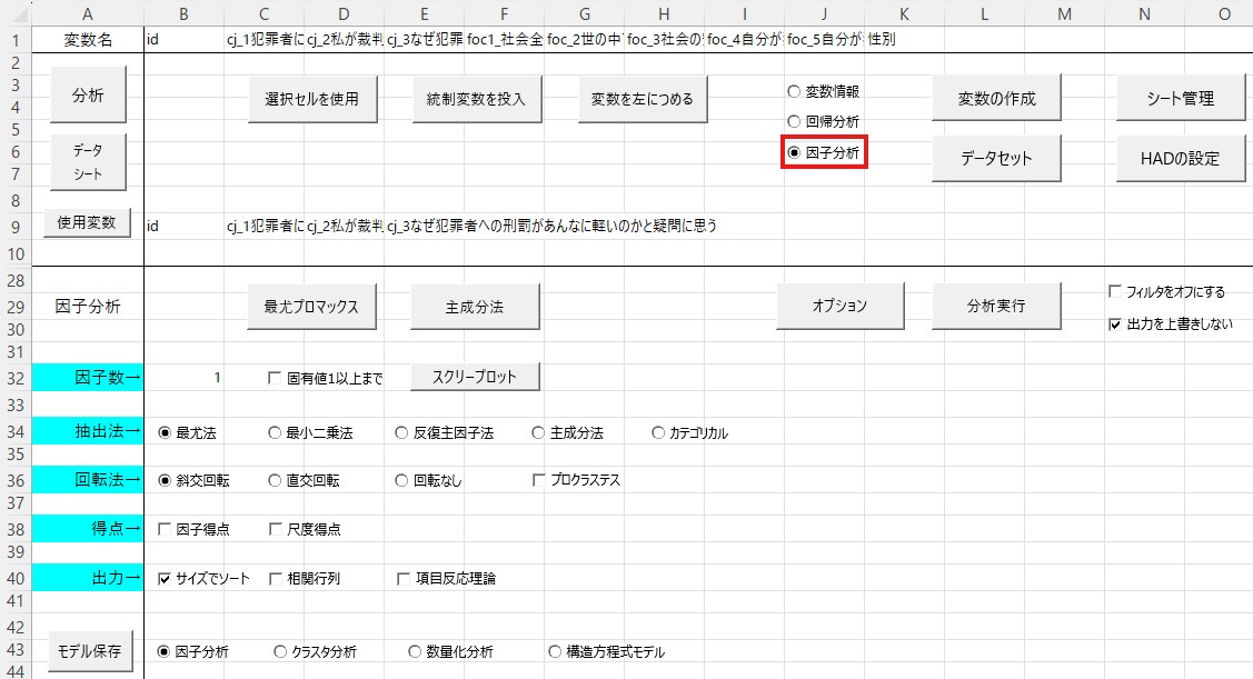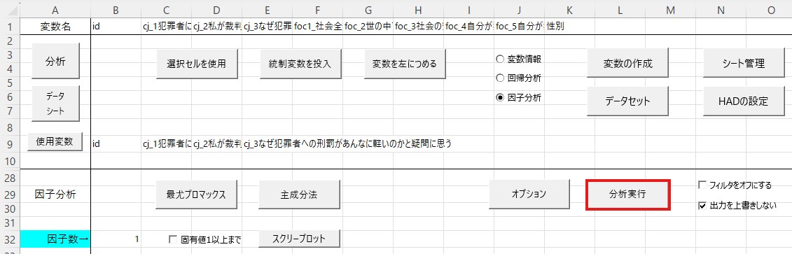以上の作業を変数(因子)の数だけ繰り返してください。例として用いているデータに含まれる犯罪不安は1因子構造ですので、もう1回処理を繰り返す必要があります。「foc_1」から「foc_5」が犯罪不安を測定する項目です。作業を完了すると以下の画像のようになります。