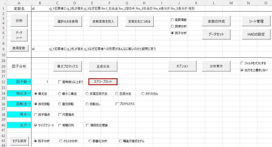因子分析の前に、因子数を決める必要があります。「スクリープロット」を左クリックしてください。