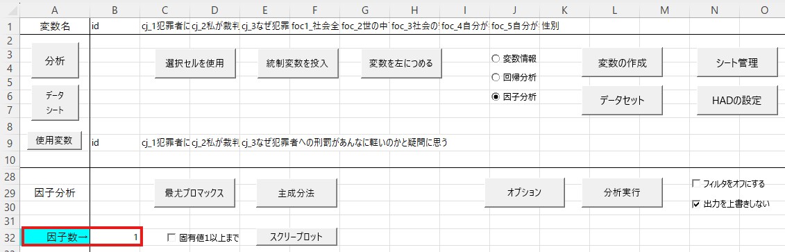 もう一度「モデリング」のシートに戻り、「因子数」に「1」を入力してください(必ず半角で入力してください)。