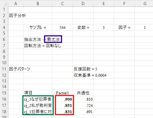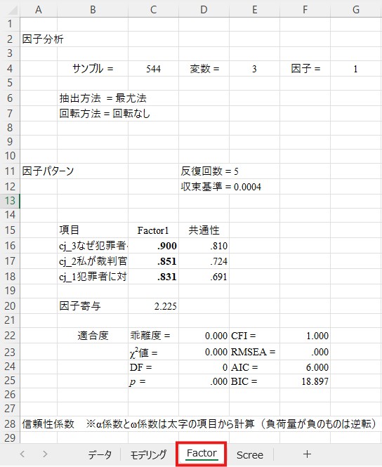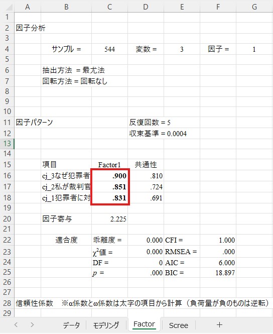このシートには、固有値や累積寄与、対角SMCの値などが表示されています。これらの数値から因子数を決定する手法には色々なものがありますが、初学者の方にとっては固有値で色が付いている因子数を選択するのが最も楽かと思います。ここでは「Factor1」に色が付いていますので、1因子構造が妥当であると判断できます。