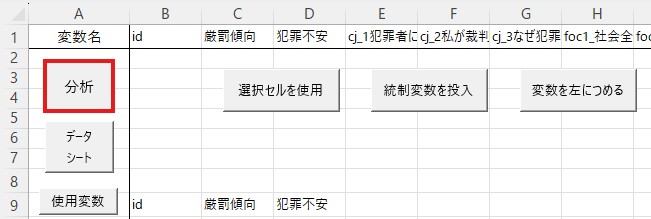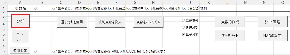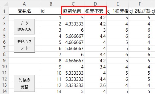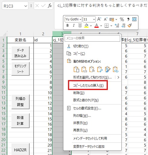 まずデータを確認します。今回のデータでは、厳罰傾向を測定する項目は3個あり、cj_1からcj_3までの列に入力されています。因子分析ではこれらのデータを使いますので、これらをコピーして、「id」の横に貼り付けてください。